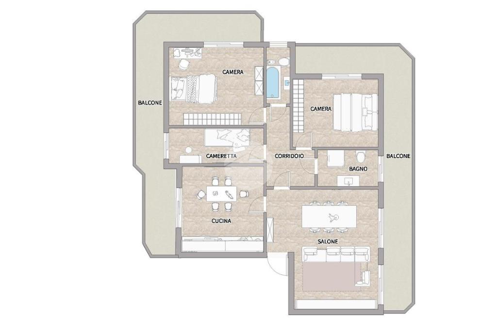 Tutti gli ambienti sono avvolti da due grandi balconate con affacci liberi, che donano luce naturale durante l’intero arco della giornata.